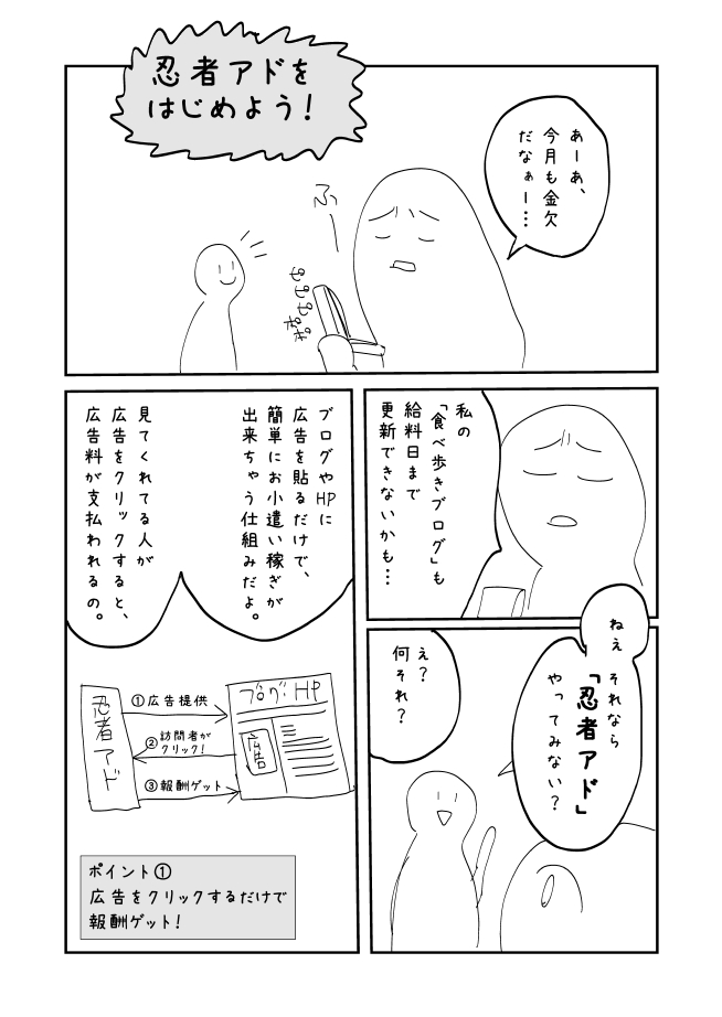 サービスの特長をうまく押さえながら読ませる展開になっていて、これから忍者アドの宣伝に力を貸してくれそうだと期待しております。